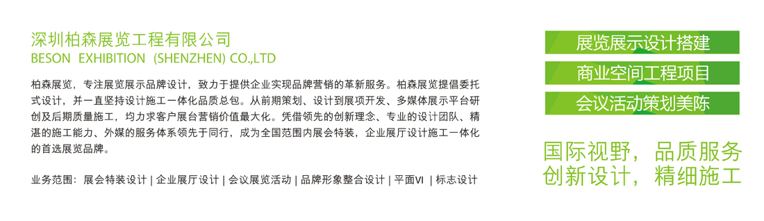 柏森展示:專注展覽展示品牌設(shè)計(jì),提供深圳展臺搭建,深圳展臺設(shè)計(jì),香港展臺搭建設(shè)計(jì),是優(yōu)質(zhì)的深圳展覽工程公司。致力于提供企業(yè)實(shí)現(xiàn)品牌營銷的革新服務(wù)。柏森展示提倡委托式設(shè)計(jì),并一直堅(jiān)持展臺設(shè)計(jì)施工一體化品質(zhì)總包。從前期展覽策劃、設(shè)計(jì)到展項(xiàng)開發(fā)、多媒體展示平臺研創(chuàng)及后期質(zhì)量施工,均力求客戶展臺營銷價(jià)值最大化。憑借領(lǐng)先的創(chuàng)新理念、專業(yè)的設(shè)計(jì)團(tuán)隊(duì)、精湛的施工能力、外媒的服務(wù)體系領(lǐng)先于同行,成為全國范圍內(nèi)展會特裝,企業(yè)展廳設(shè)計(jì)施工一體化的首選展覽品牌公司。